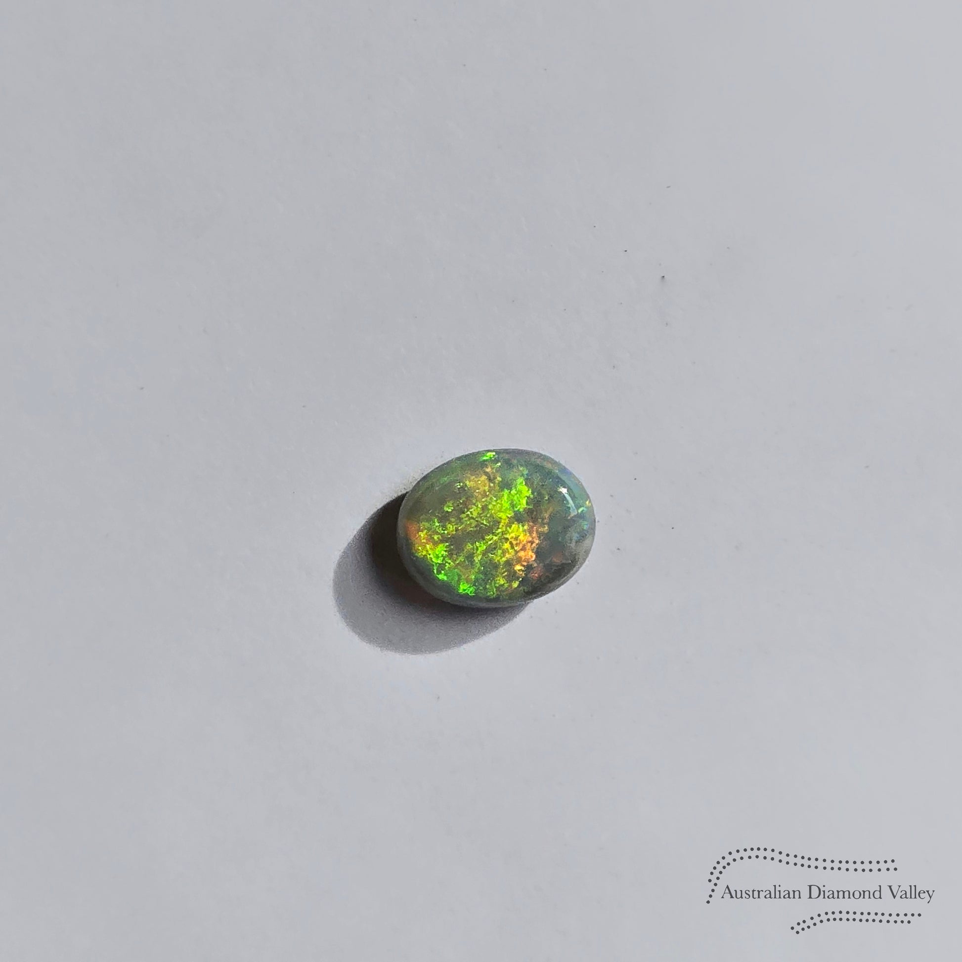 A serene 0.78ct single oval Australian Opal, coloured graded as milky Blue/Orange/yellow with multicoloured flashes, presented in a premium leather patterned collectors box.