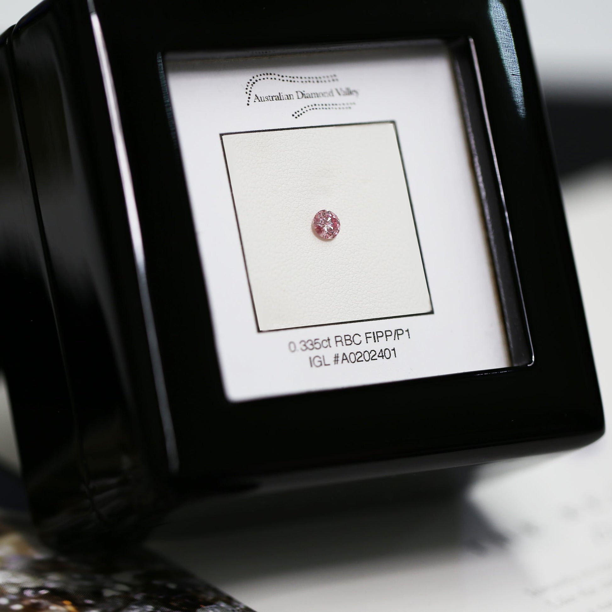 A single 0.335 carat round brilliant cut pink diamond of Argyle origin, graded 5PP - 5 Purplish Pink (Natural Fancy Intense Purplish Pink), part of the NUNA collection. Presented in a premium leather patterned collectors box.