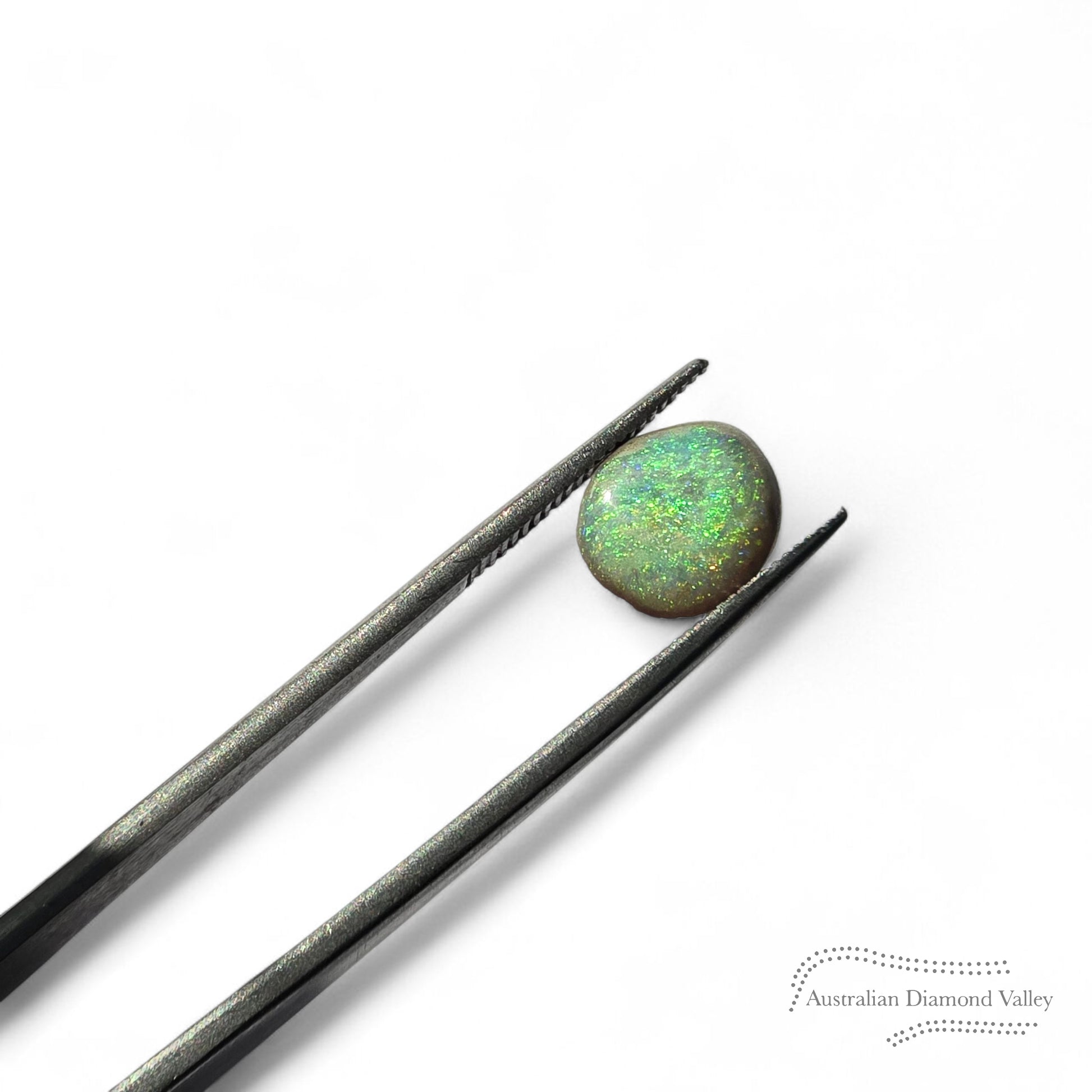 An oval cabochon Australian opal, weighing 1.47 carats, coloured graded green with multicoloured flashes, presented in a premium leather patterned collectors box.