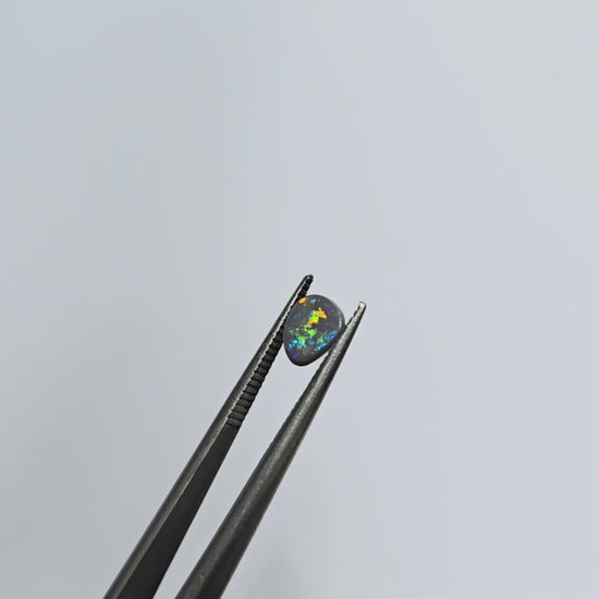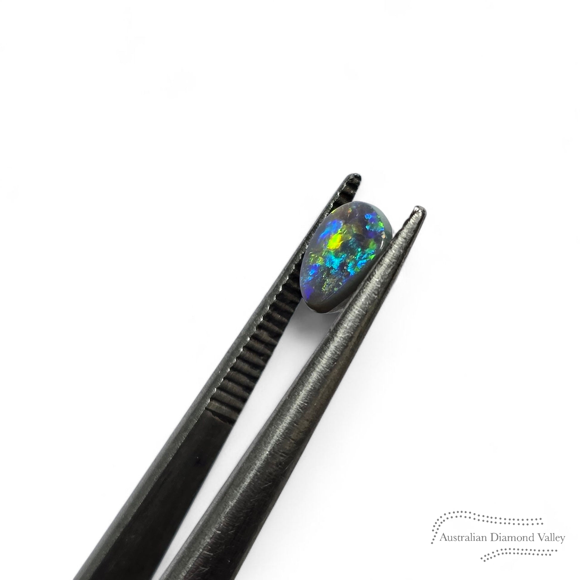 A freeform cabochon Australian opal weighing 0.43ct, colour-graded with vivid purple, blue, green, and yellow tones, enhanced by multicoloured flashes. Presented in a premium leather-patterned collector’s box.