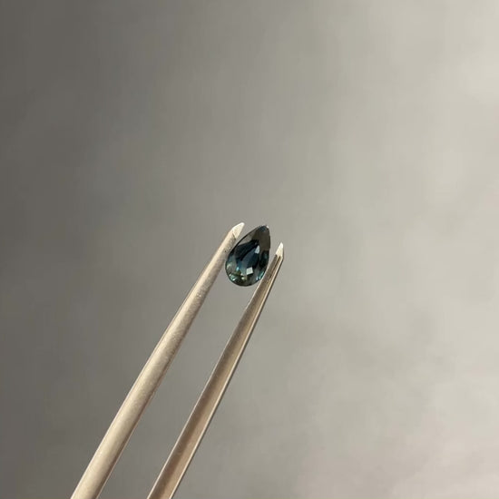A beautiful 0.28ct single pear cut teal parti Australian Sapphire, coloured graded as dark Teal, presented in a premium leather patterned collectors box.