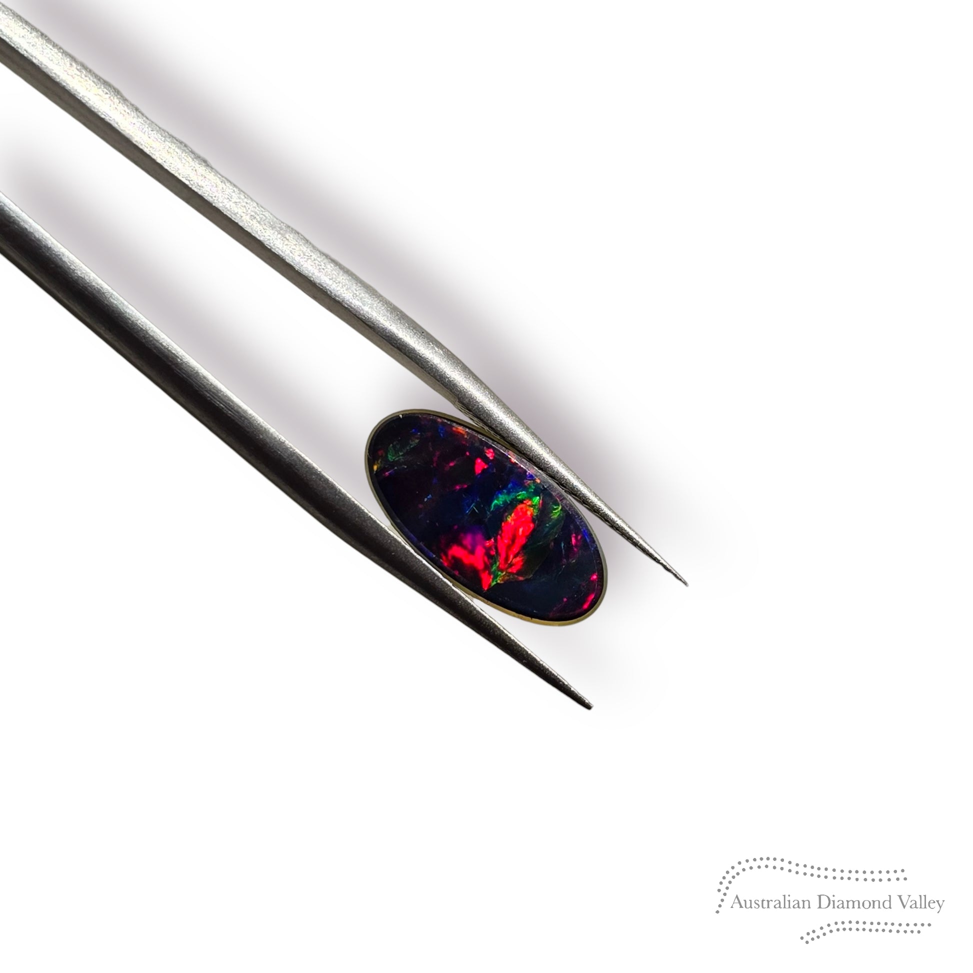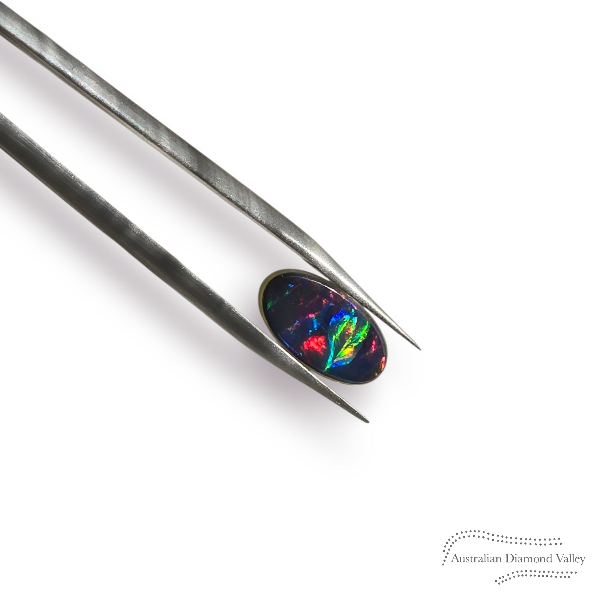 An oval cut Australian Opal equalling in 2.11ct, coloured graded as blue/green/red with multicoloured flashes, presented in a premium leather patterned collectors box.