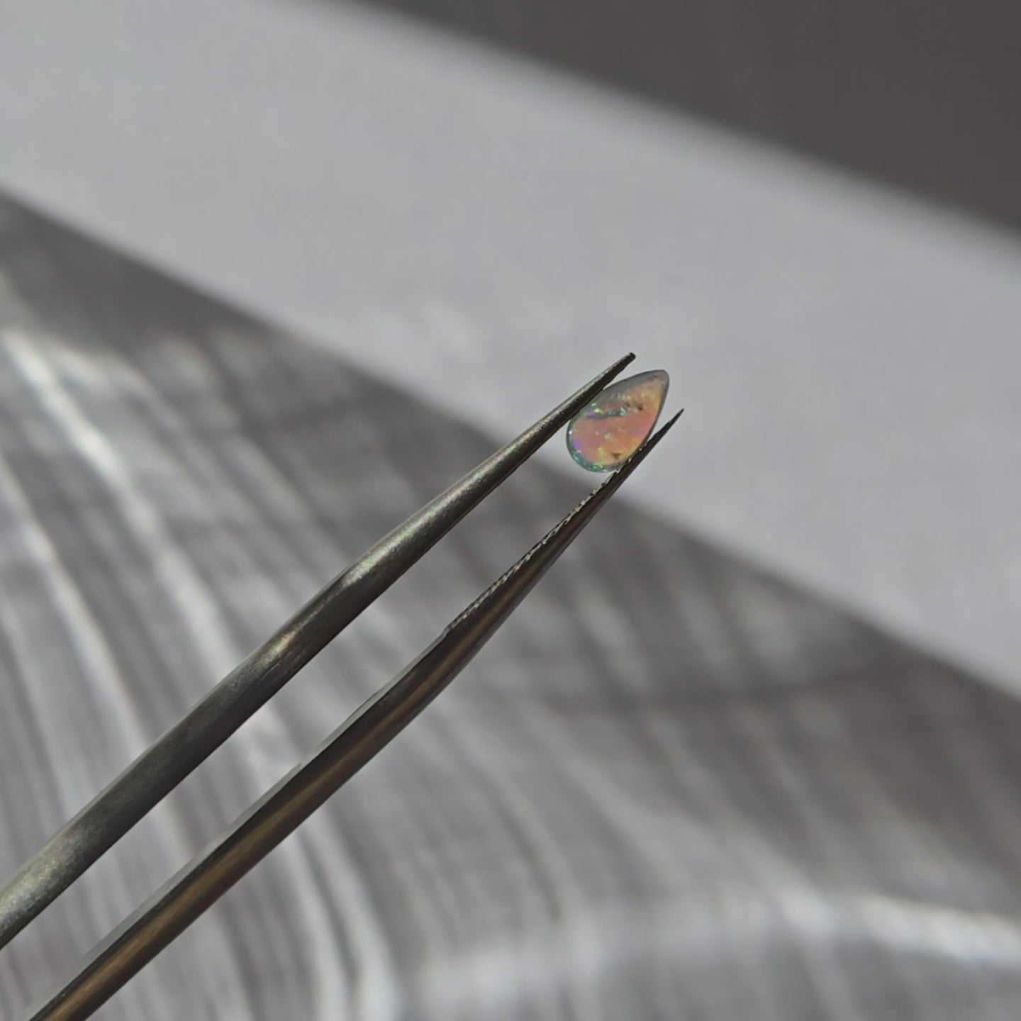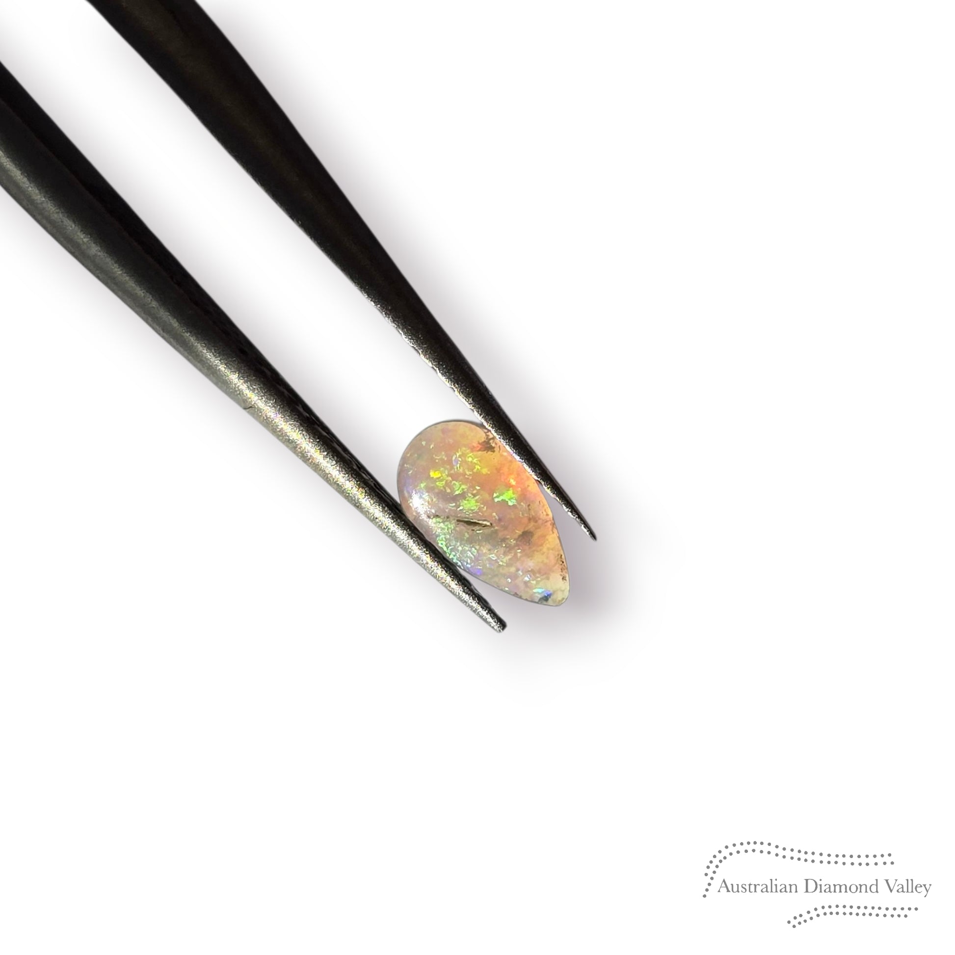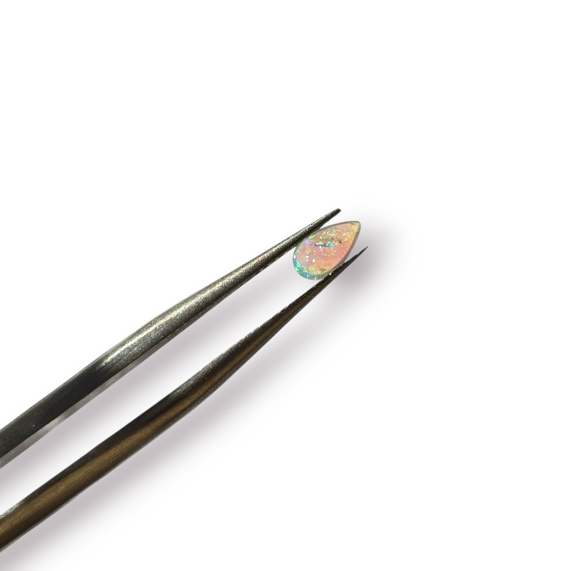 A pear cut Australian Opal equalling in 0.13ct, coloured graded as blue/green/red/yellow/orange with multicoloured flashes, presented in a premium leather patterned collectors box.