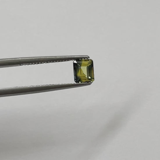 A stunning 0.59ct single emerald cut Australian Sapphire, Colour graded as Yellow/Blue, presented in a premium leather patterned collectors box.