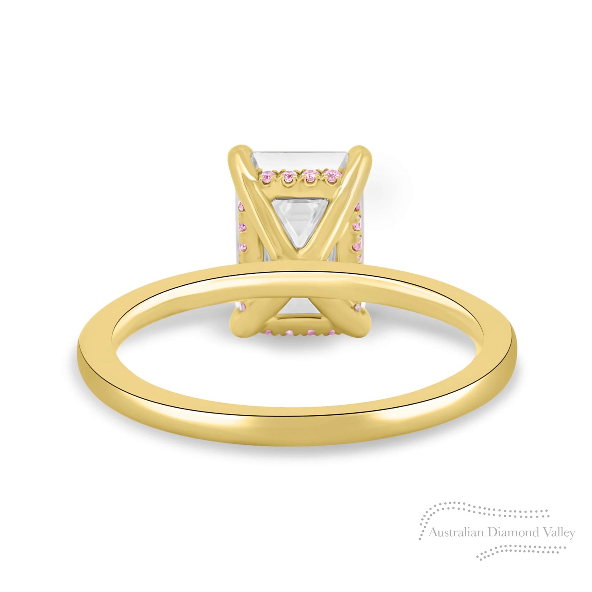 The listed price is for the ring setting only and includes the Argyle-origin pink diamonds in the halo. The band measures 1.8mm in width. The centre stone shown is a 2.00ct emerald-cut lab-grown diamond, available separately through our Diamond Search page.