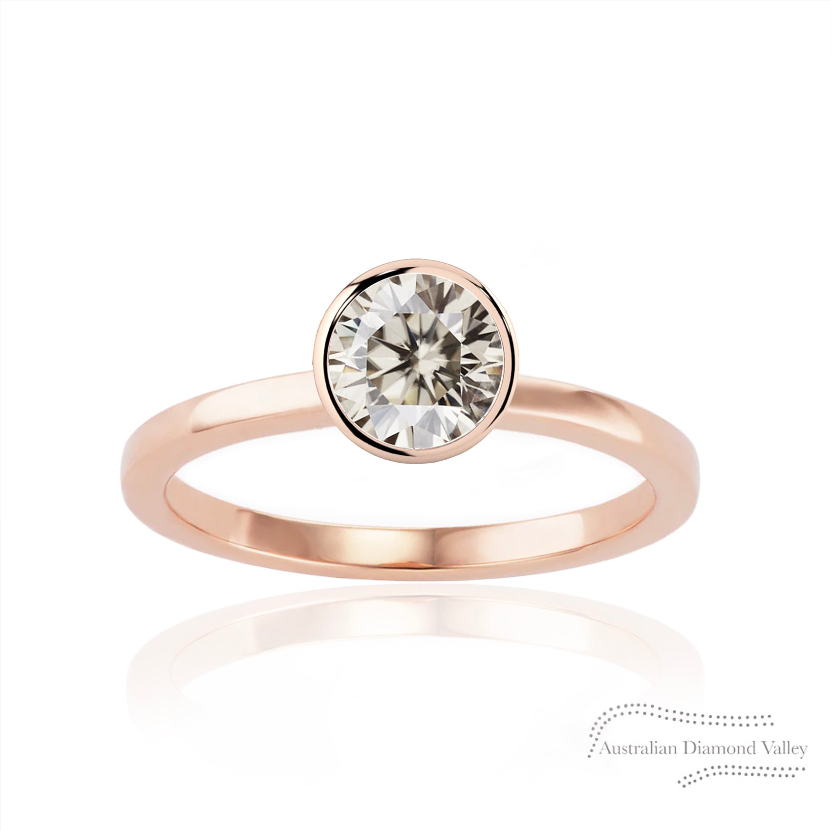 A stunning round brilliant cut Argyle origin champagne diamond is set on a 18kt rose gold band. A beautifully designed ring with a bezel setting detail.