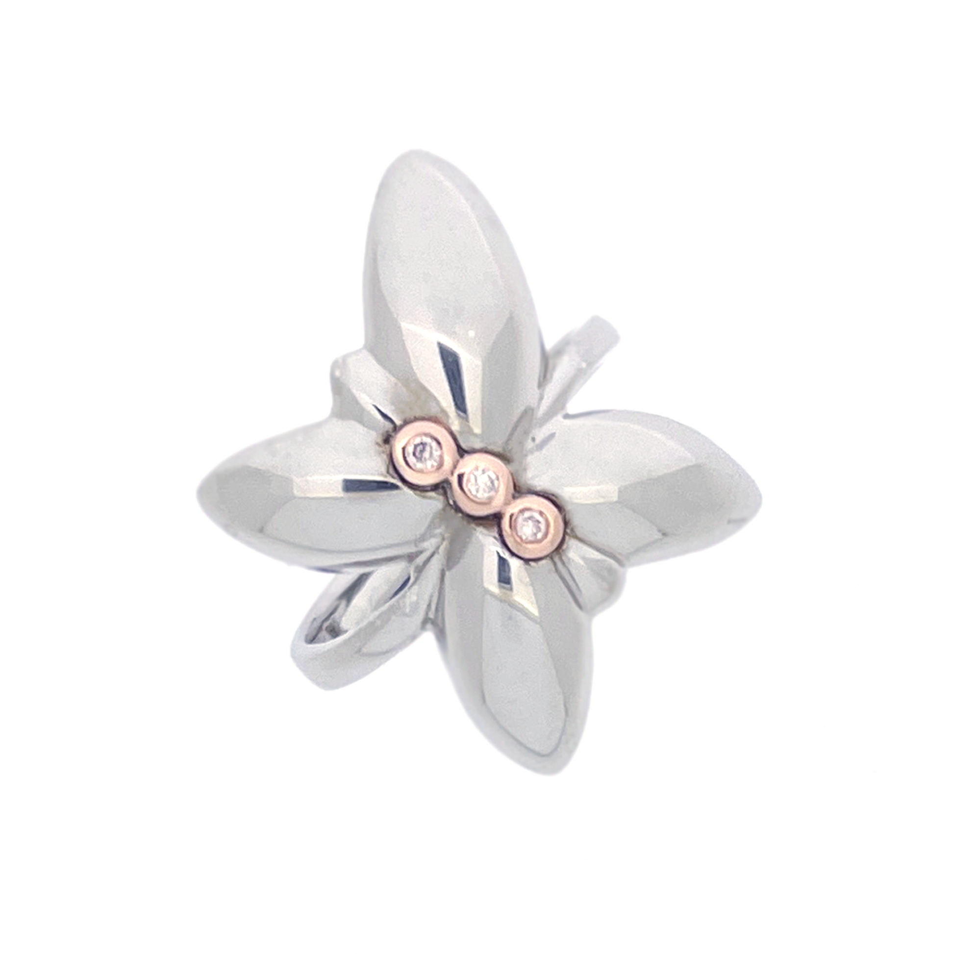 Our handcrafted Butterfly Ring features three pink Australian Argyle origin diamonds set in 9K Rose Gold, within a beautiful solid sterling silver abstract butterfly form.