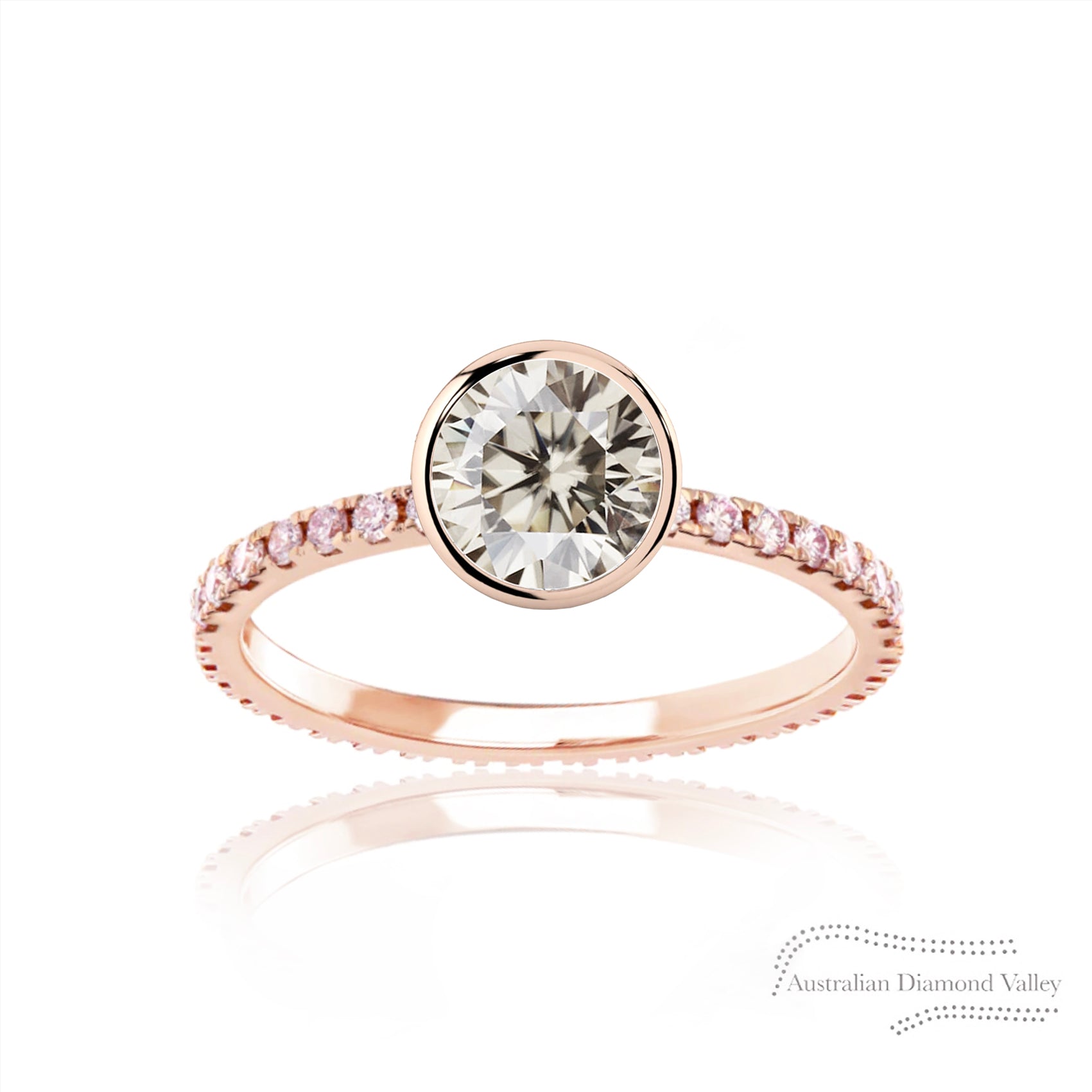 A stunning round brilliant cut Argyle origin champagne diamond is set on a band of pink Argyle origin diamonds. Crafted in 18kt rose gold. A beautifully designed ring with bezel and claw setting details.
