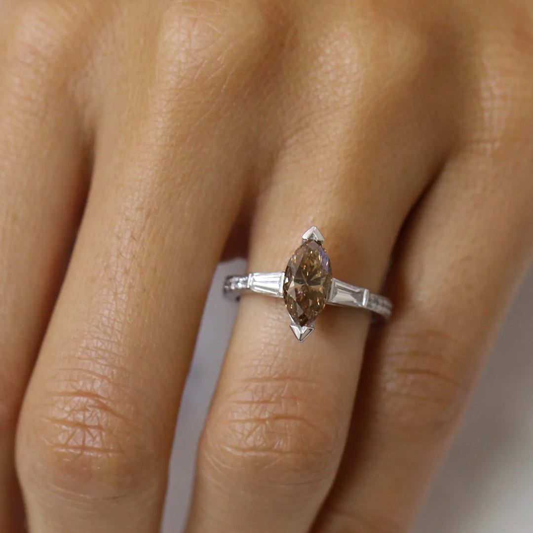 An elegant, deco style ring featuring a single cognac marquise diamond of Argyle origin set between two baguette cut white diamonds and accentuated with sparkling white round brilliant cut diamonds. Handcrafted in 18kt white gold.