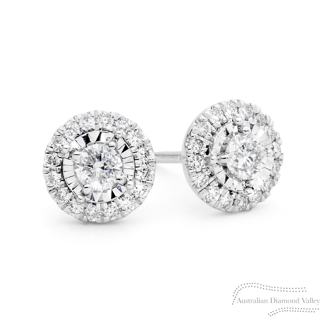 Our stunning 9K white gold round Cloud earrings features 34 round brilliant cut Argyle Australian diamonds, a total of 0.34 carats. Set with a post and butterfly fitting for pierced ears.