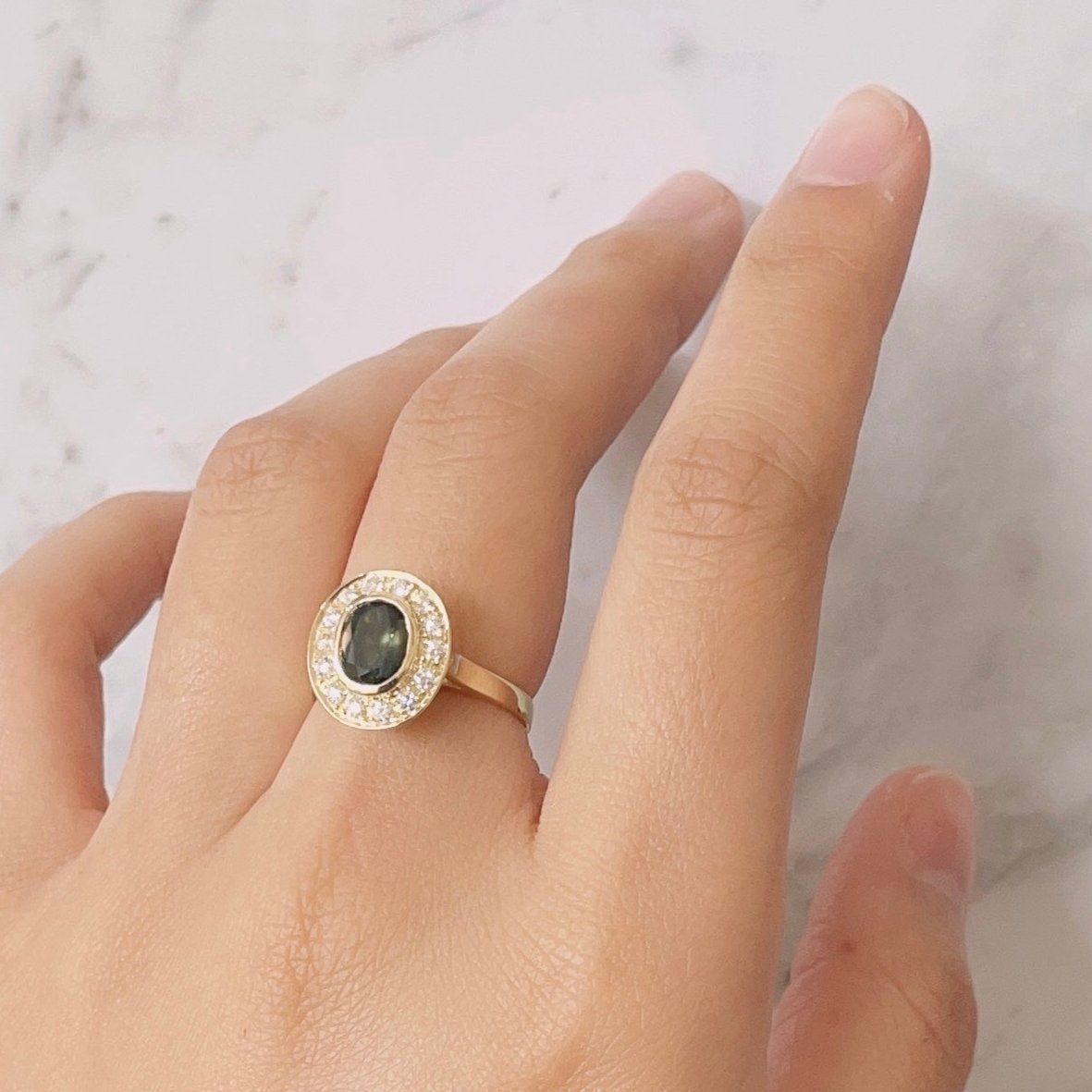 An elegant vintage-inspired design crafted for beautiful oval-cut yellow/green parti sapphire highlighted with sparkling white diamonds, Set in 18K yellow gold.