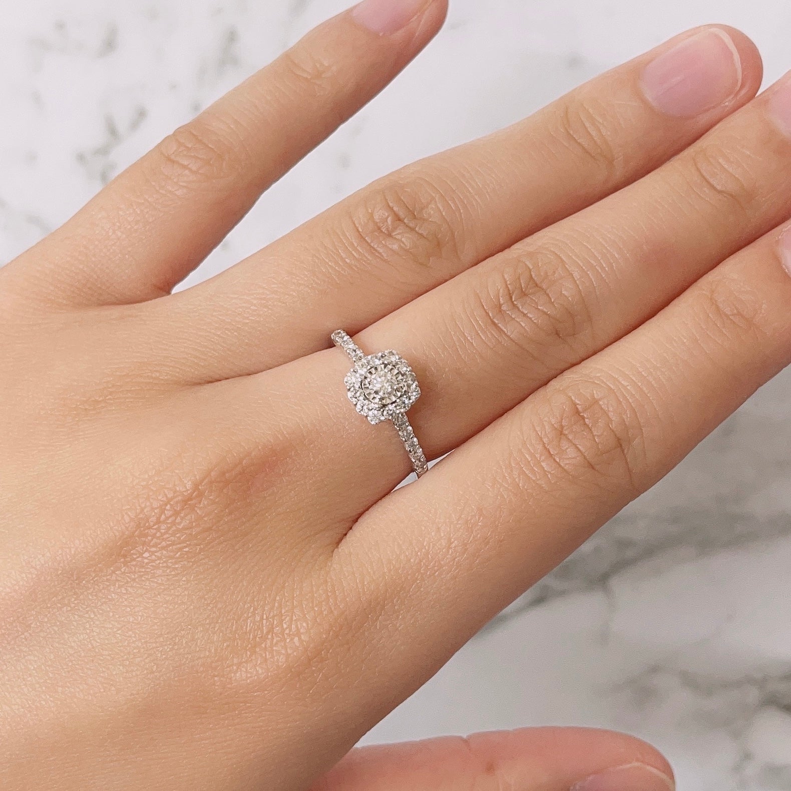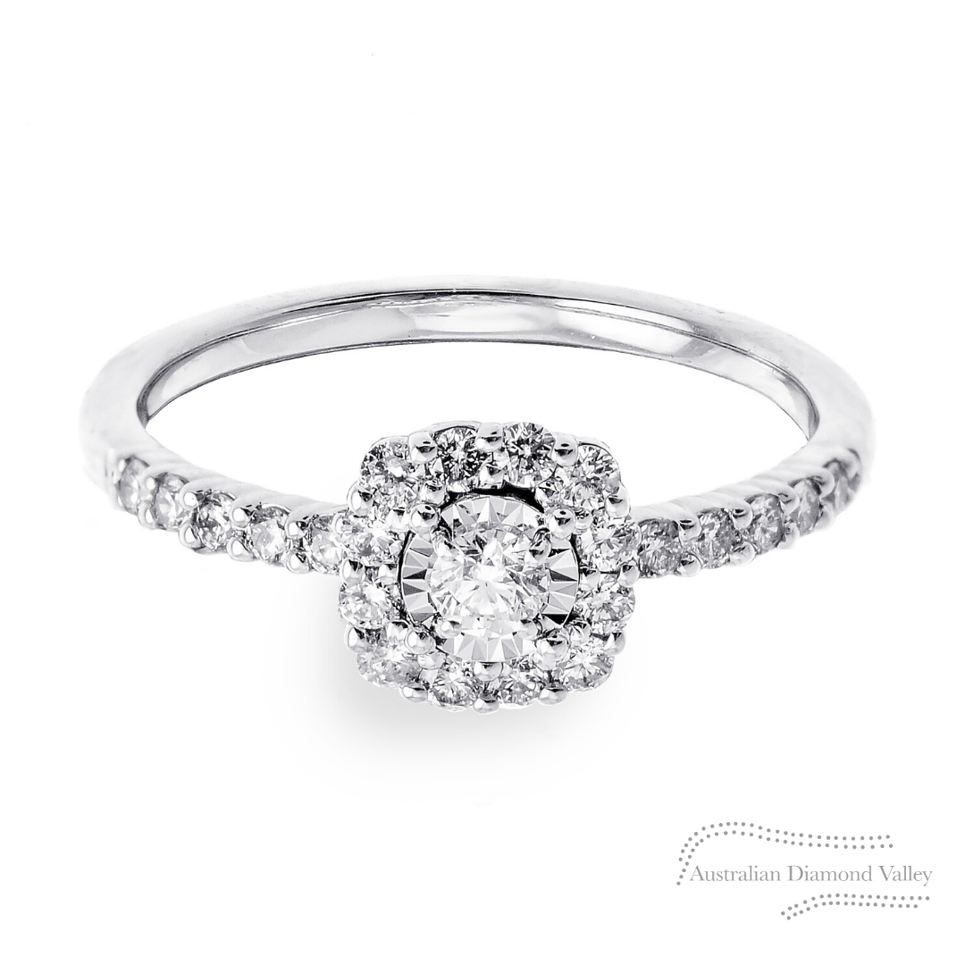 Our cushion-shaped Sea ring features 23 round brilliant-cut Argyle Australian diamonds, a total of 0.47 carats.