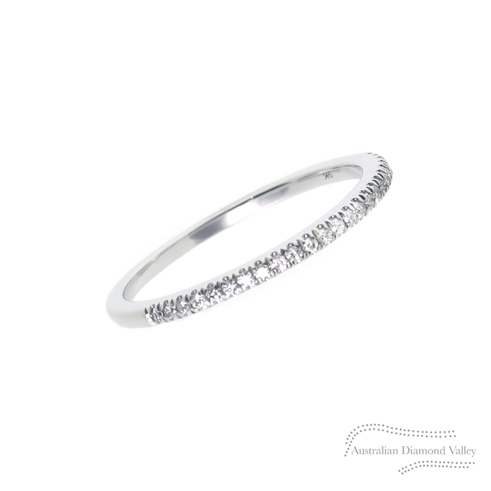 Our beautifully fine 9kt white gold Sunset diamond ring band features 24 perfectly set round brilliant cut Argyle Australian diamonds, a total of 0.10 carats.