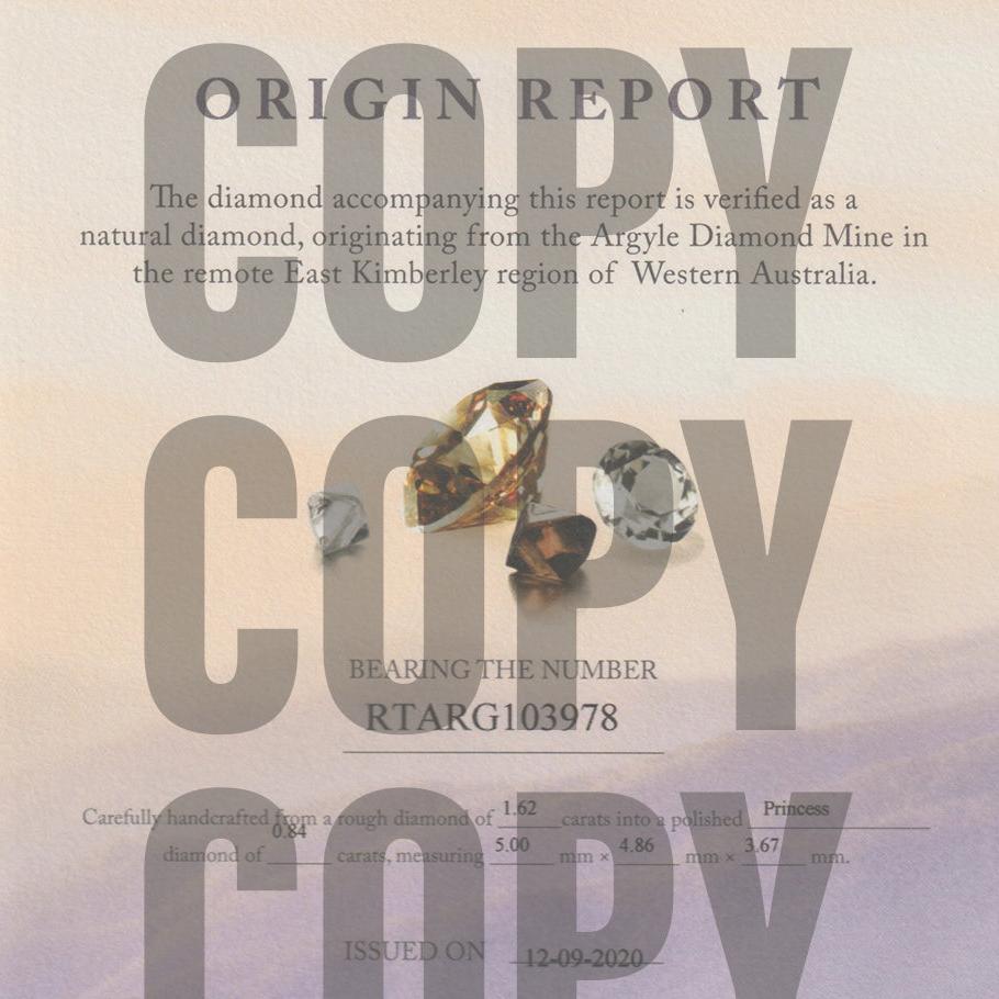 Argyle origin champagne diamonds share the same special birthplace as the pink Argyle diamond, located in the East Kimberley of Western Australia. Both are responsibly mined by the Argyle Pink Diamond Mine (Rio Tinto Ltd). A Certificate of Authenticity accompanies each champagne Argyle diamond, including a declaration of its Western Australian origin and the official colour grade. ADV Authenticity is assured with a tamper evident secure seal.