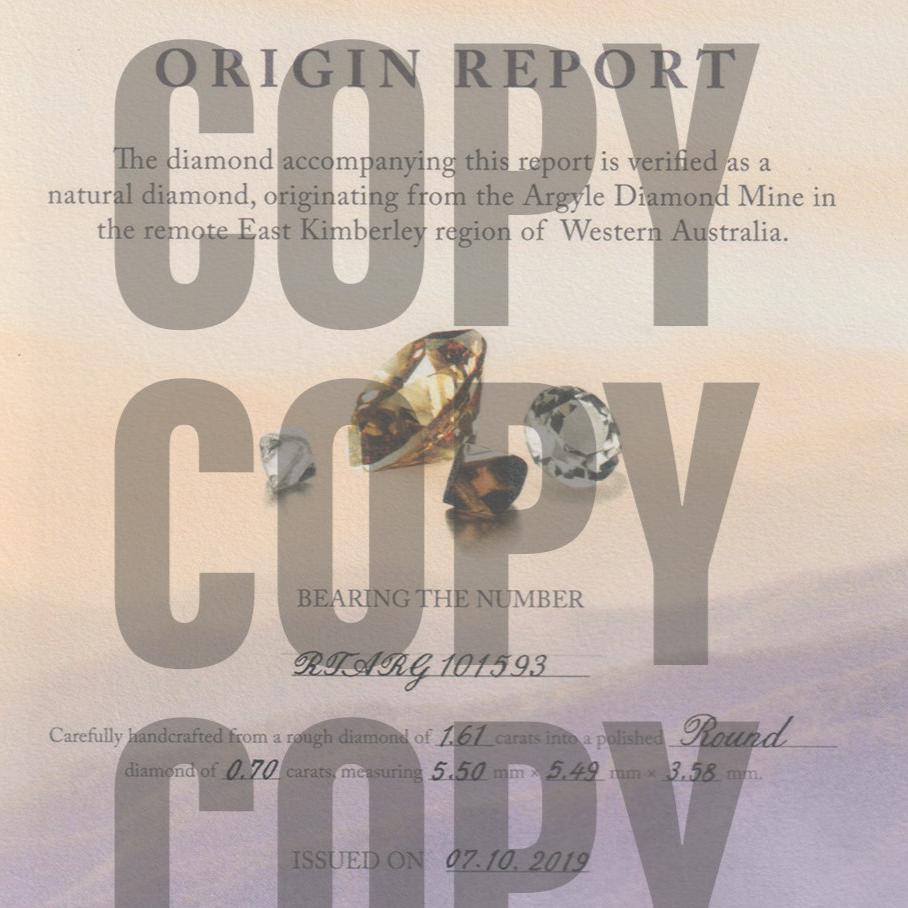 Argyle origin champagne diamonds share the same special birthplace as the pink Argyle diamond, located in the East Kimberley of Western Australia. Both are responsibly mined by the Argyle Pink Diamond Mine (Rio Tinto Ltd). A Certificate of Authenticity accompanies each champagne Argyle diamond, including a declaration of its Western Australian origin and the official colour grade. Authenticity is assured with a tamper evident secure seal.