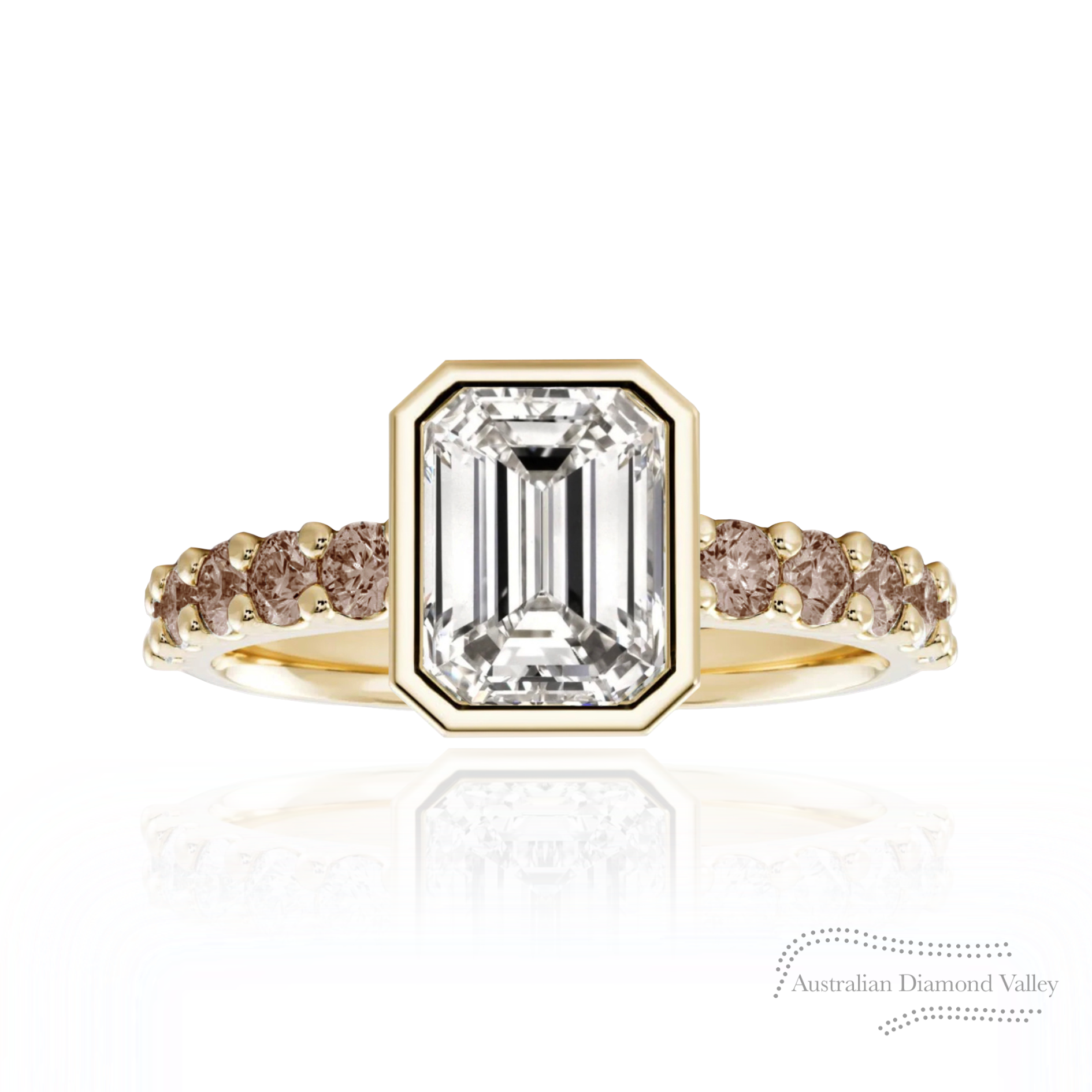 The Ellis Ring features a beautiful bezel-set emerald cut stone. Expertly crafted, this design showcases 12 round brilliant cut natural dark champagne diamonds of Argyle origin set on the shoulders of the band.