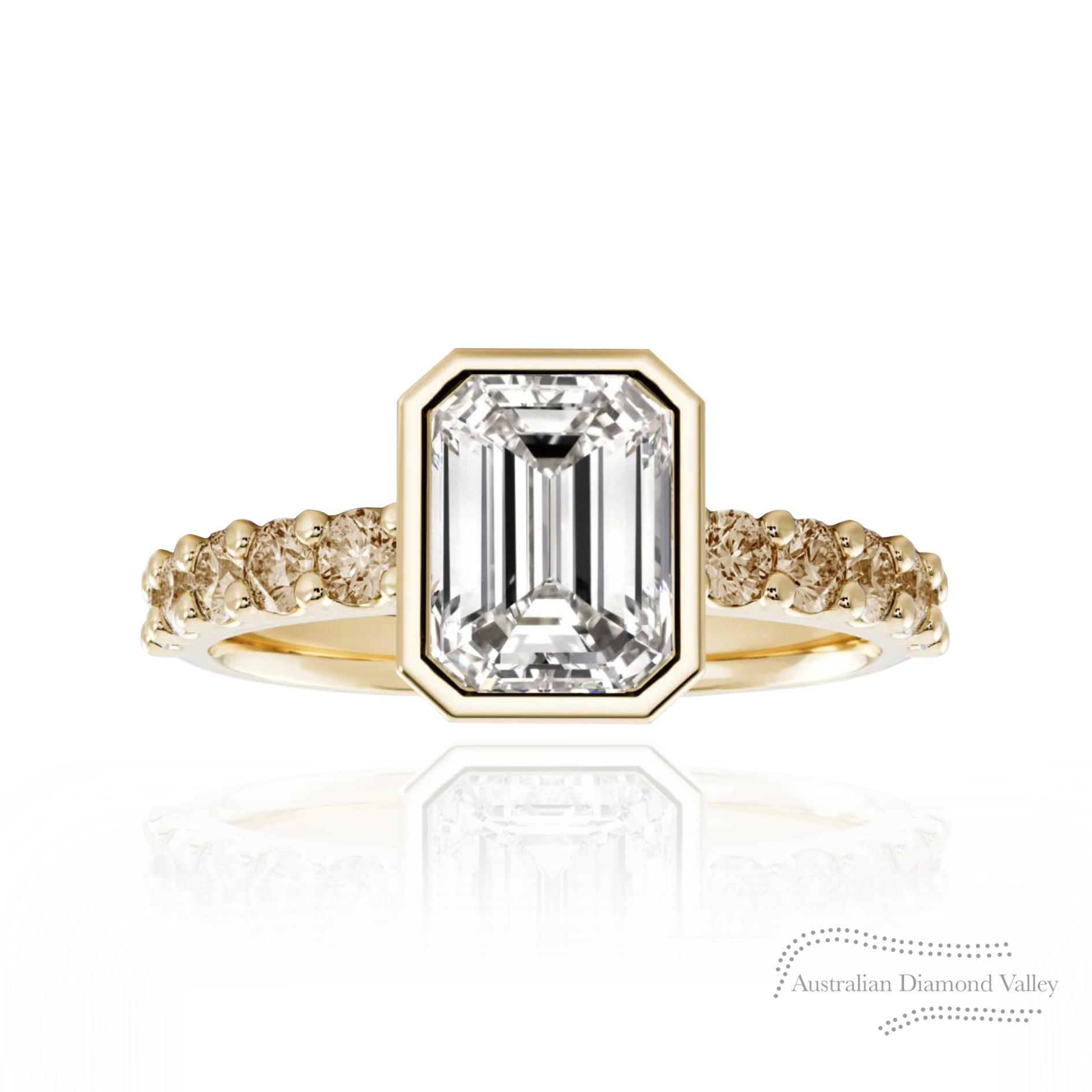 The Ellis Ring features a beautiful bezel-set emerald cut stone. Expertly crafted, this design showcases 12 round brilliant cut natural light champagne diamonds of Argyle origin set on the shoulders of the band.
