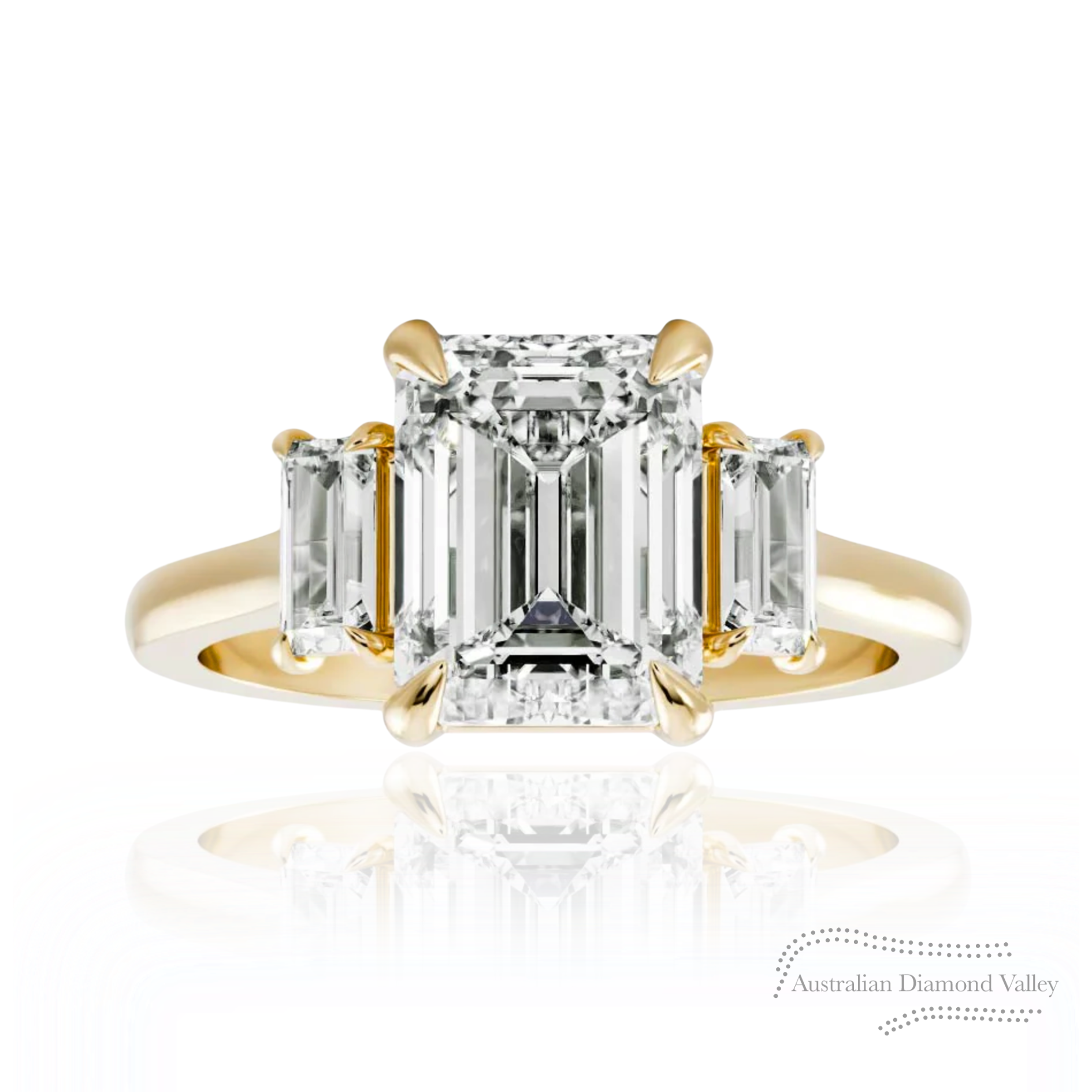 The Emberton Ring features an elegant claw-set emerald cut diamond, flanked by two perfectly balanced claw-set emerald cut natural diamonds. Expertly crafted in Sydney by ADV’s master jewellers.