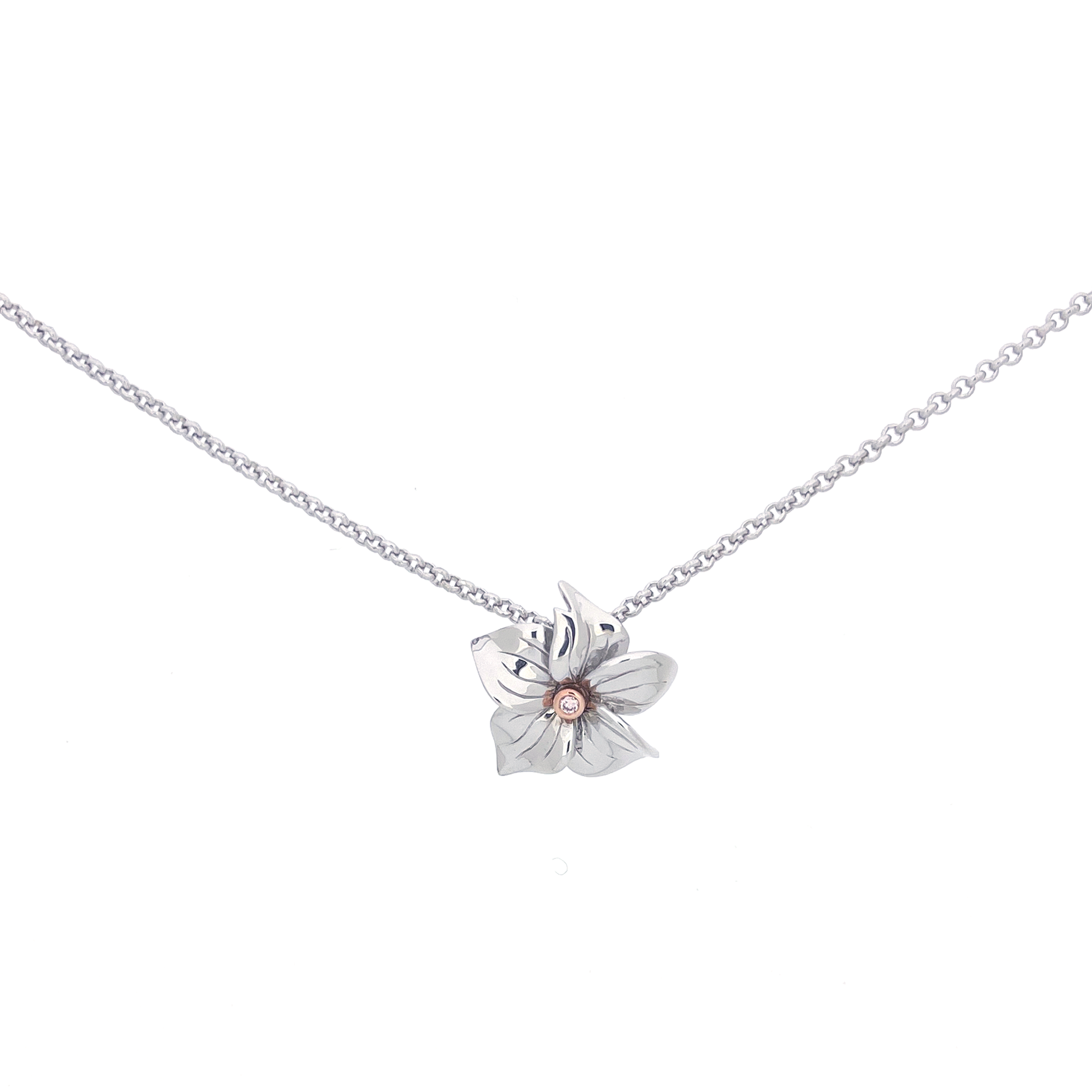 Our handcrafted Floral Necklace features a single pink Australian Argyle origin diamond set in 9K Rose Gold, set within beautiful sterling silver petals.