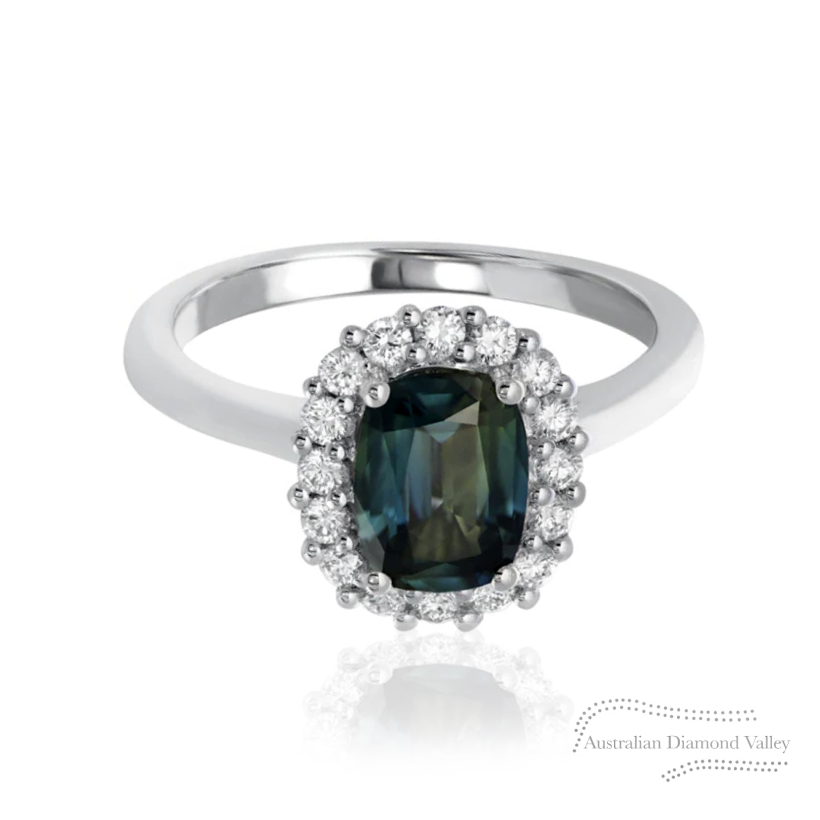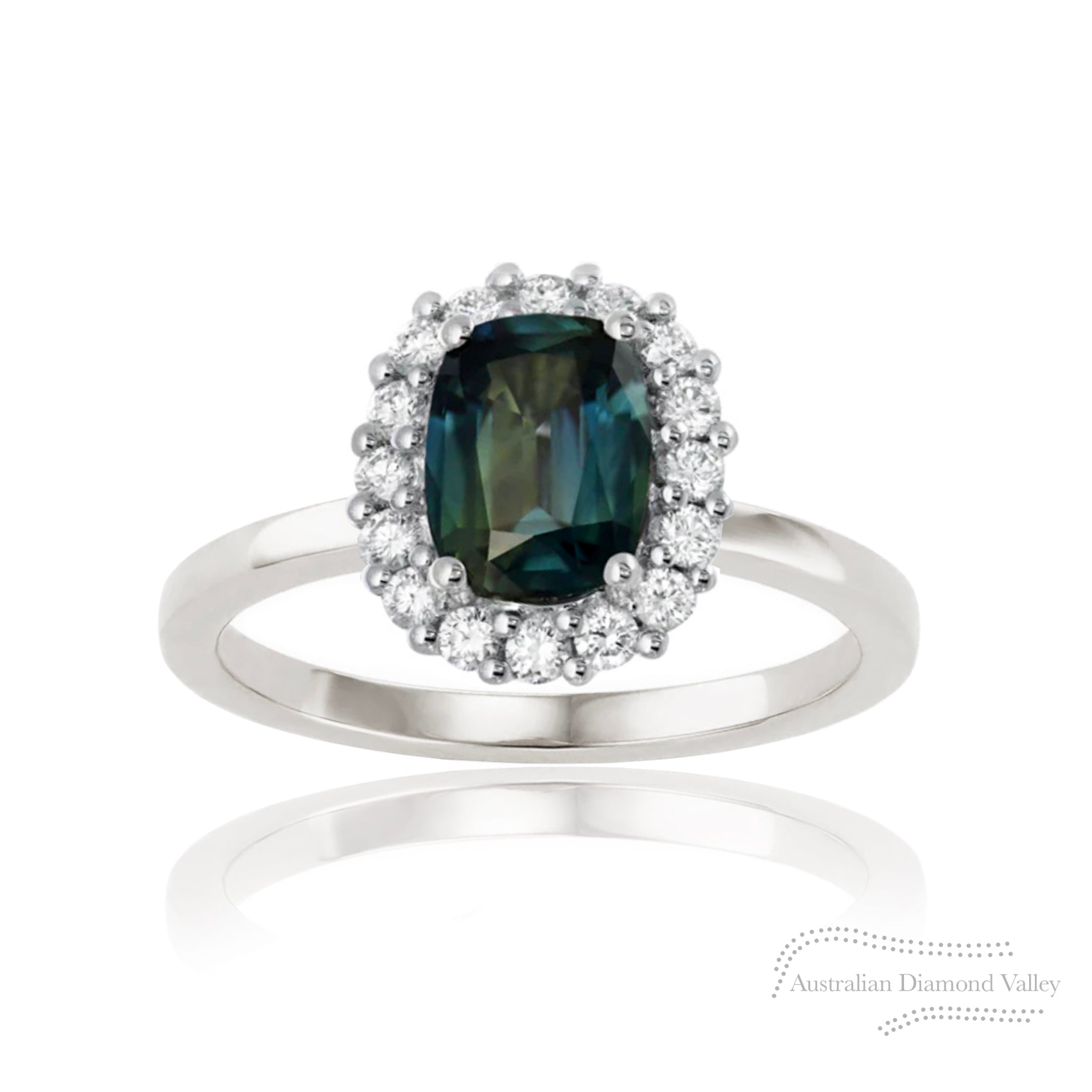 An elegant Australian sapphire ring set within a sparkling white diamond halo, mounted on a classic polished 18K white gold ring band.