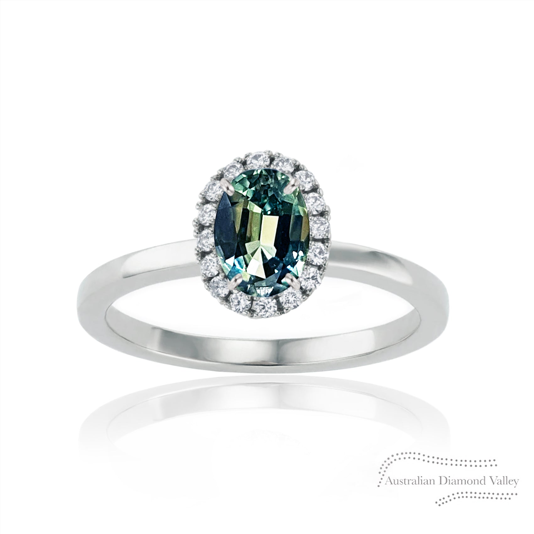 Select a stunning Australian sapphire and have it set within a halo of white Argyle origin diamonds. Crafted in 18kt white Australian gold. A beautifully designed ring with claw setting details.