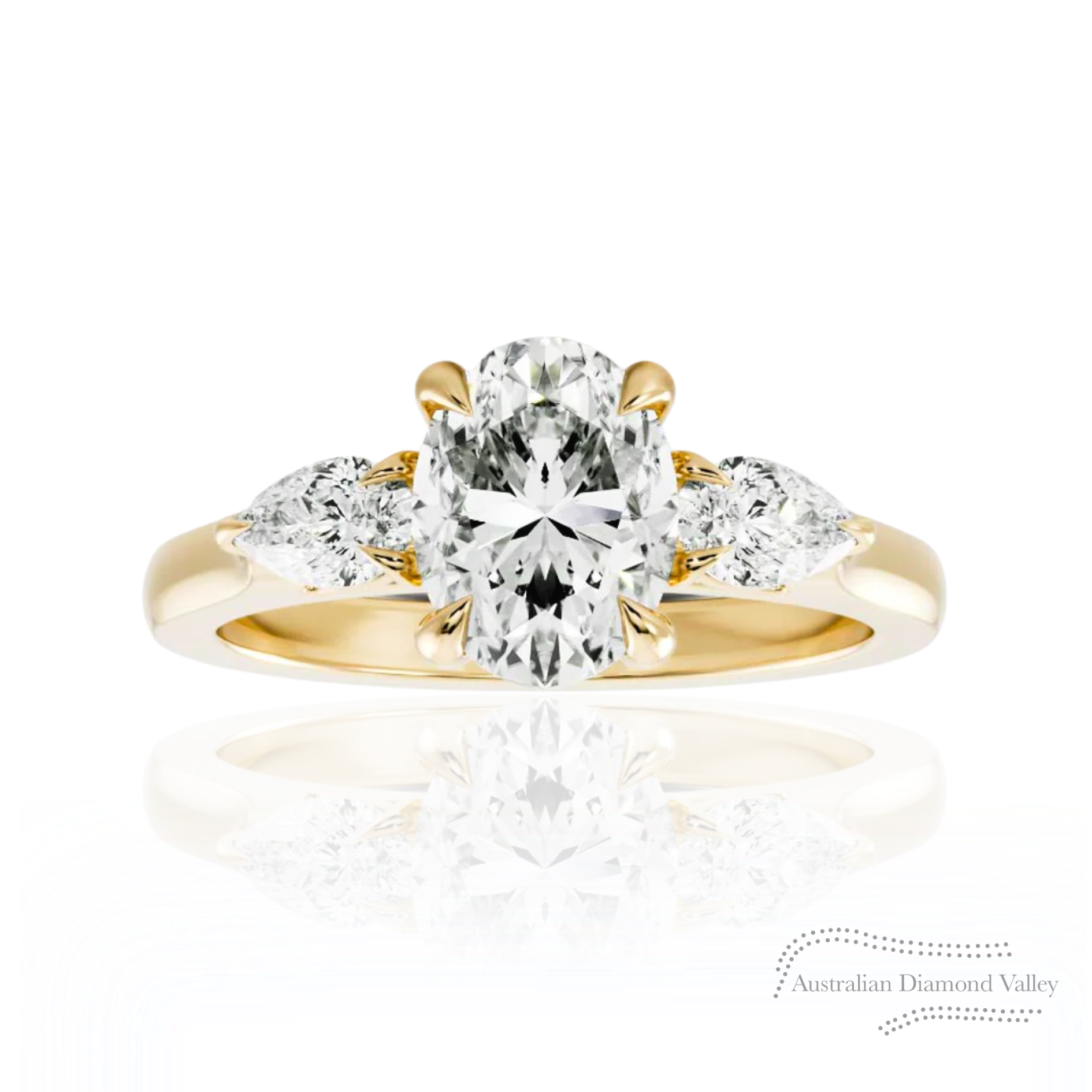 The Inverlea Ring features a stunning claw-set oval cut diamond, flanked by two claw-set pear cut natural diamonds for a refined, heritage silhouette. Expertly crafted in Sydney by ADV’s master jewellers.