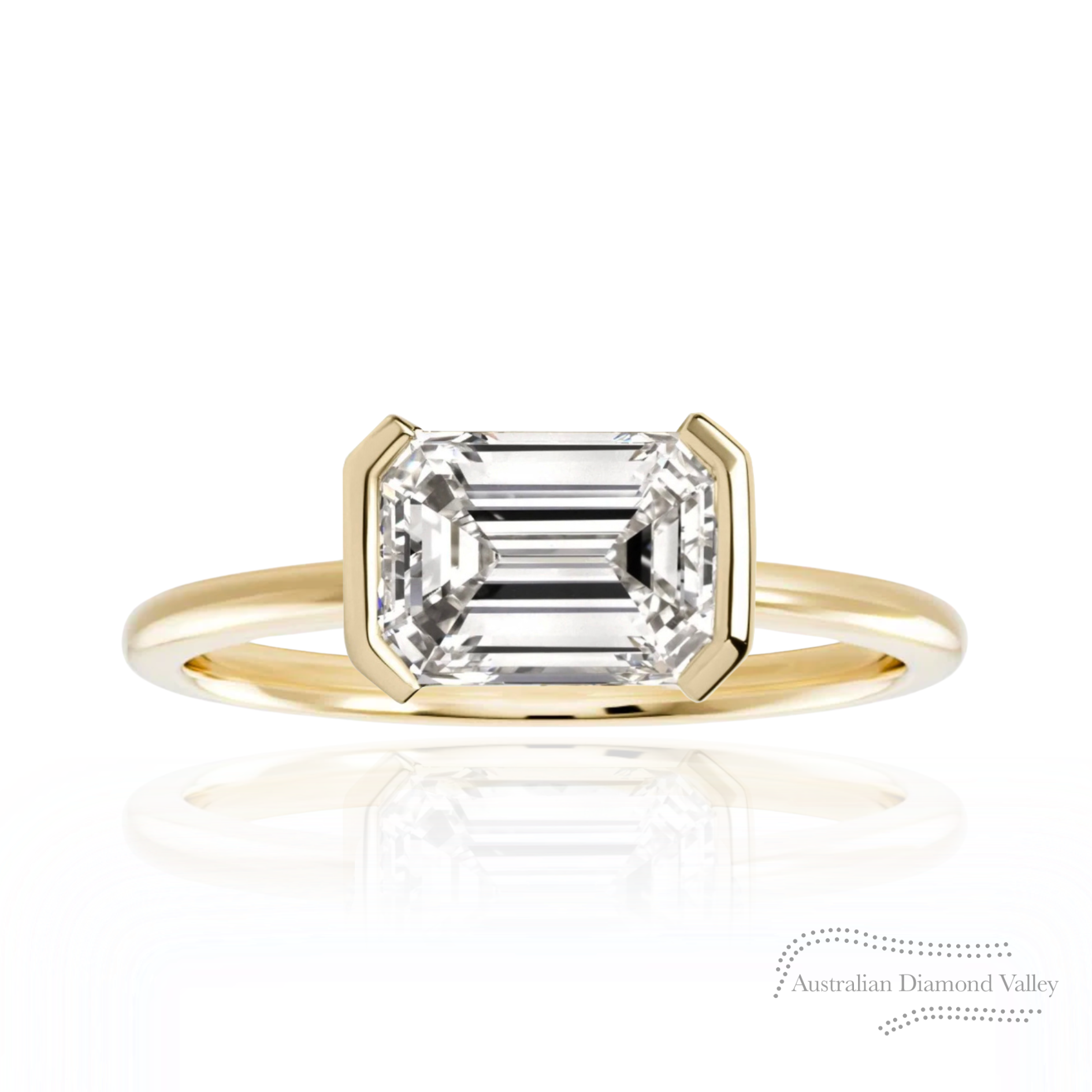 The Lynden Ring features a sophisticated east–west set emerald cut centre stone framed in an open bezel, crafted with precision by ADV’s master jewellers for a refined, contemporary silhouette.