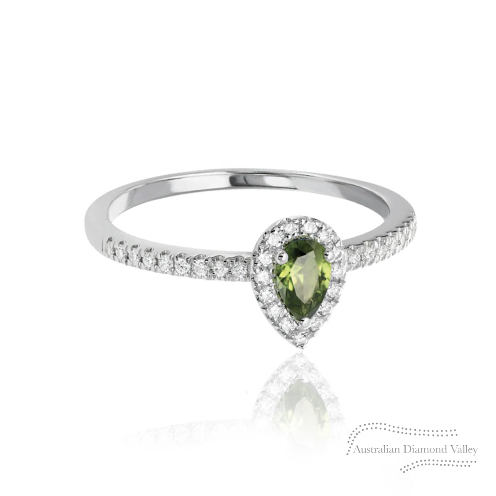 A gorgeously green Australian sapphire set within a sparkling white diamond halo, with diamonds running down the shoulders of the ring.
