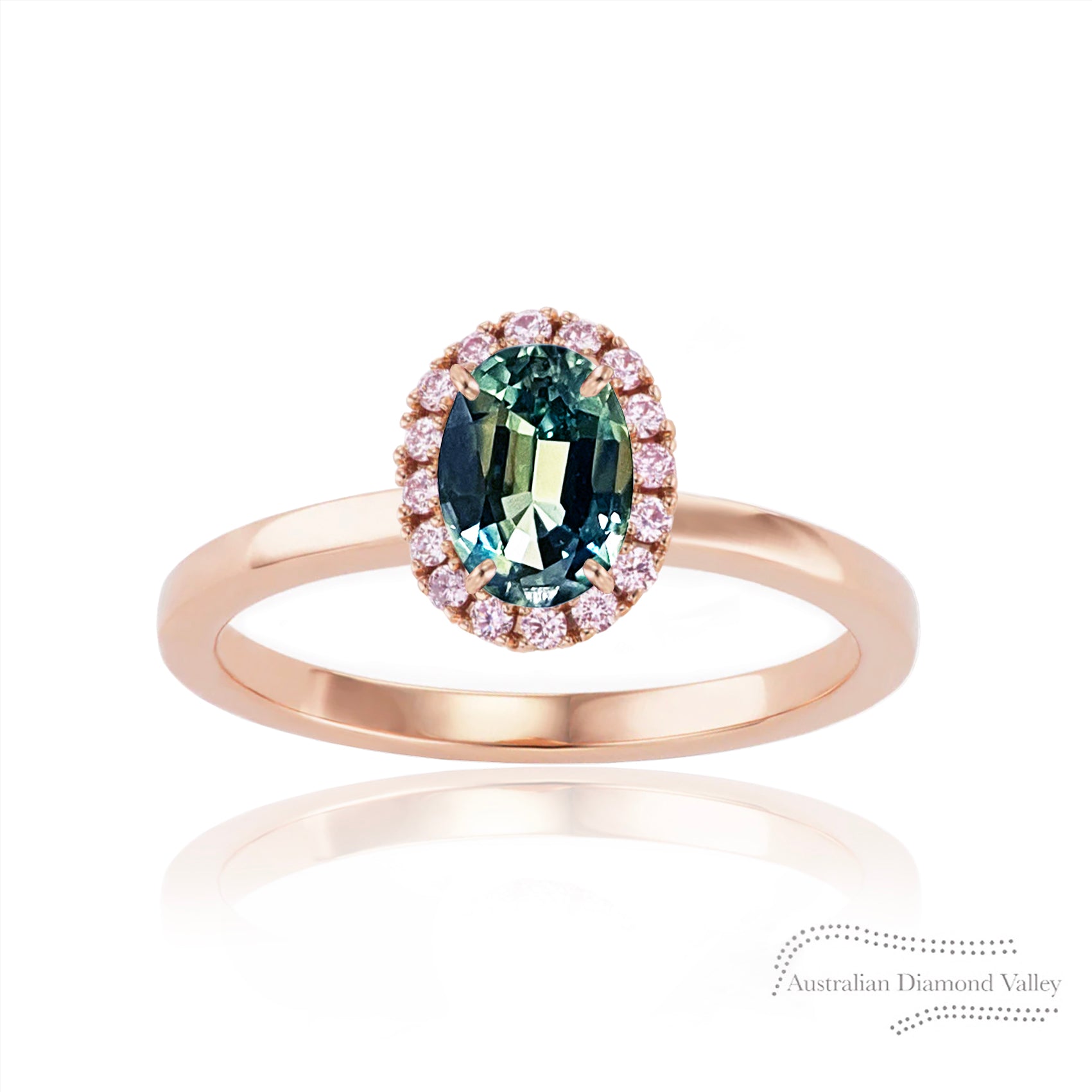 Select a beautiful Australian sapphire and have it set within a halo of blushing pink Argyle origin diamonds. Crafted in 18kt rose gold. A beautifully designed ring with delicate claw setting details.