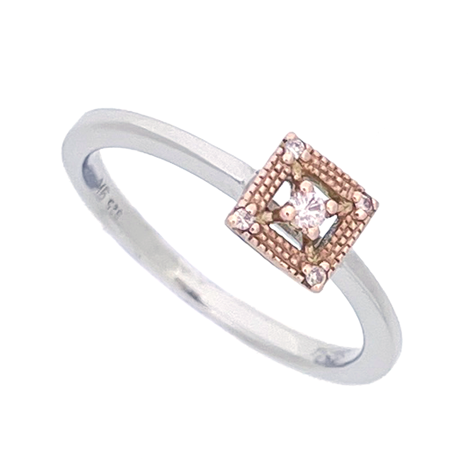 Our handcrafted Piazza Ring features a single pink Australian Argyle origin diamond set in the centre and four pink Australian Argyle origin diamonds around each corner set in 9ct Rose Gold, within a beautiful solid Rose Gold square shape.