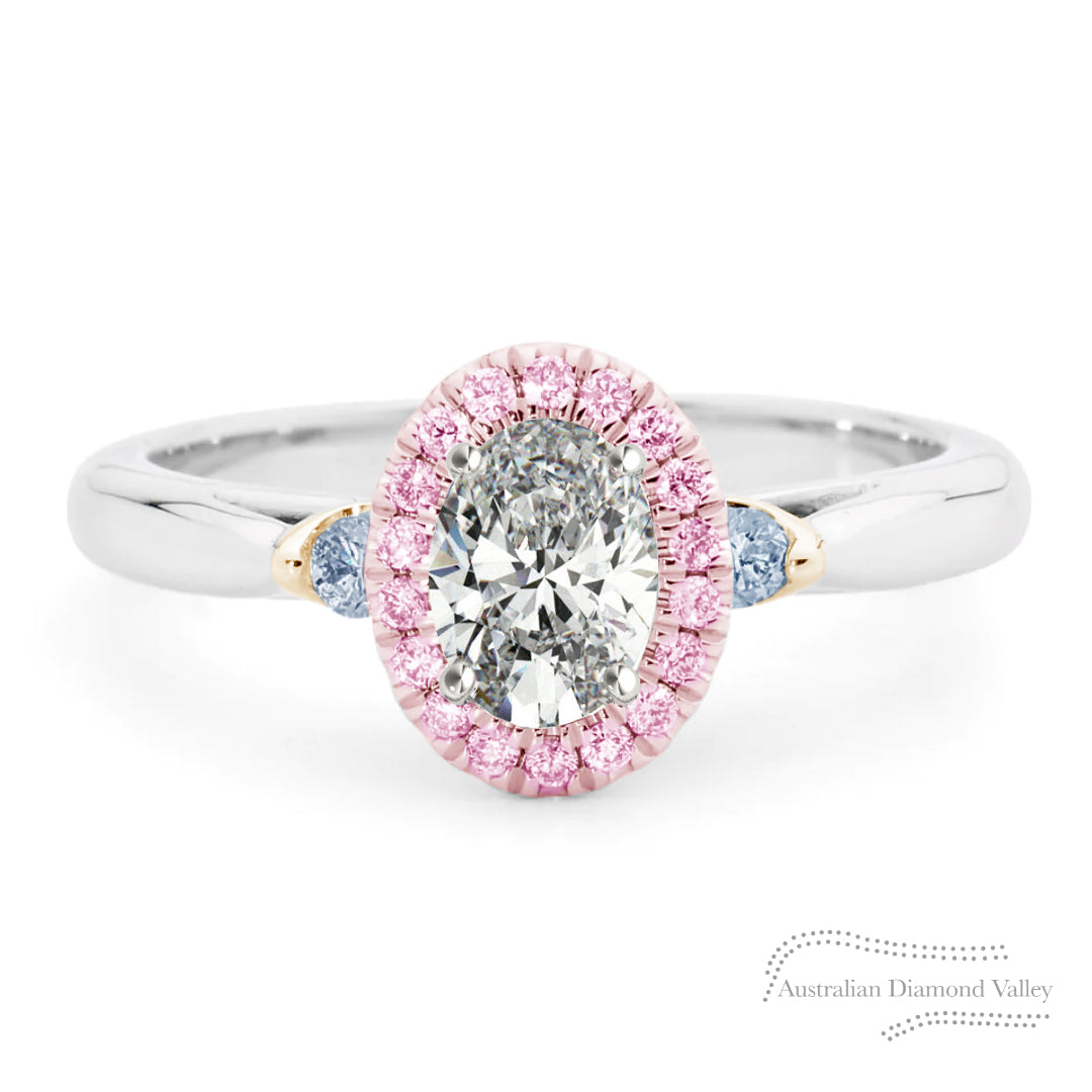 Our vintage style, oval shaped Ocean ring features a single 0.50ct oval cut diamond, surrounded by a halo of 5P Argyle origin pink diamonds and two stunning Argyle origin blue diamonds. Handcrafted in platinum with 18kt rose and yellow gold settings.