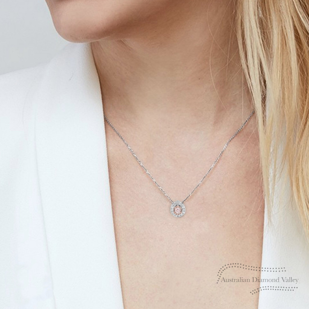 Our pear-shaped Pink Rain Drop necklace features 15 White Australian Argyle origin diamonds surrounding a single stunning Pink Argyle origin diamond, colour graded 8P. This pendant has a total of 0.21 carats of diamonds. Set on a fine white gold chain, length 45 centimetres.