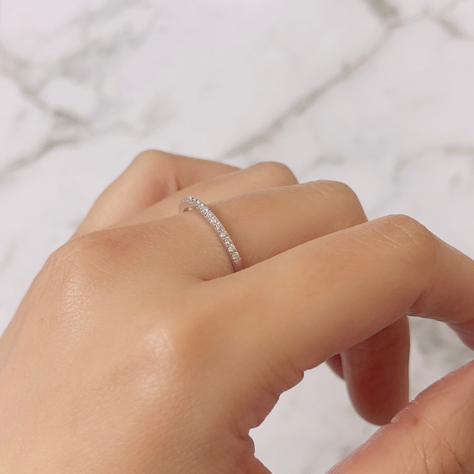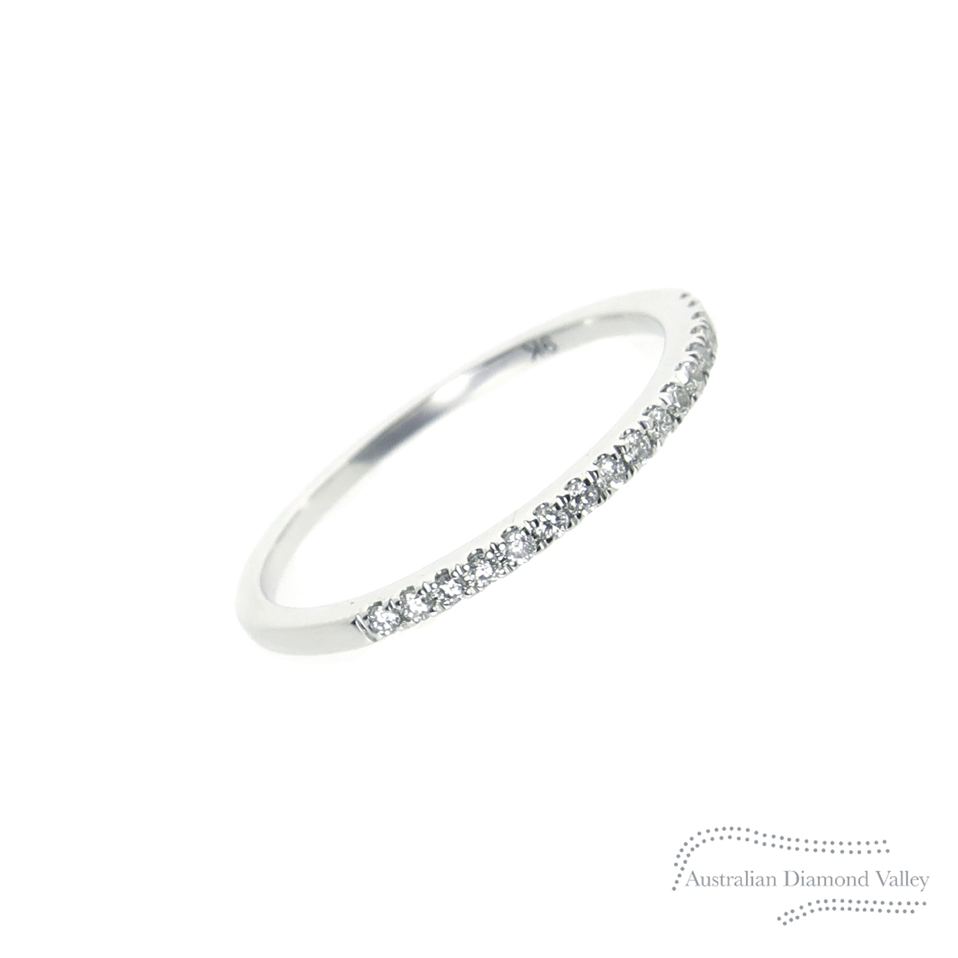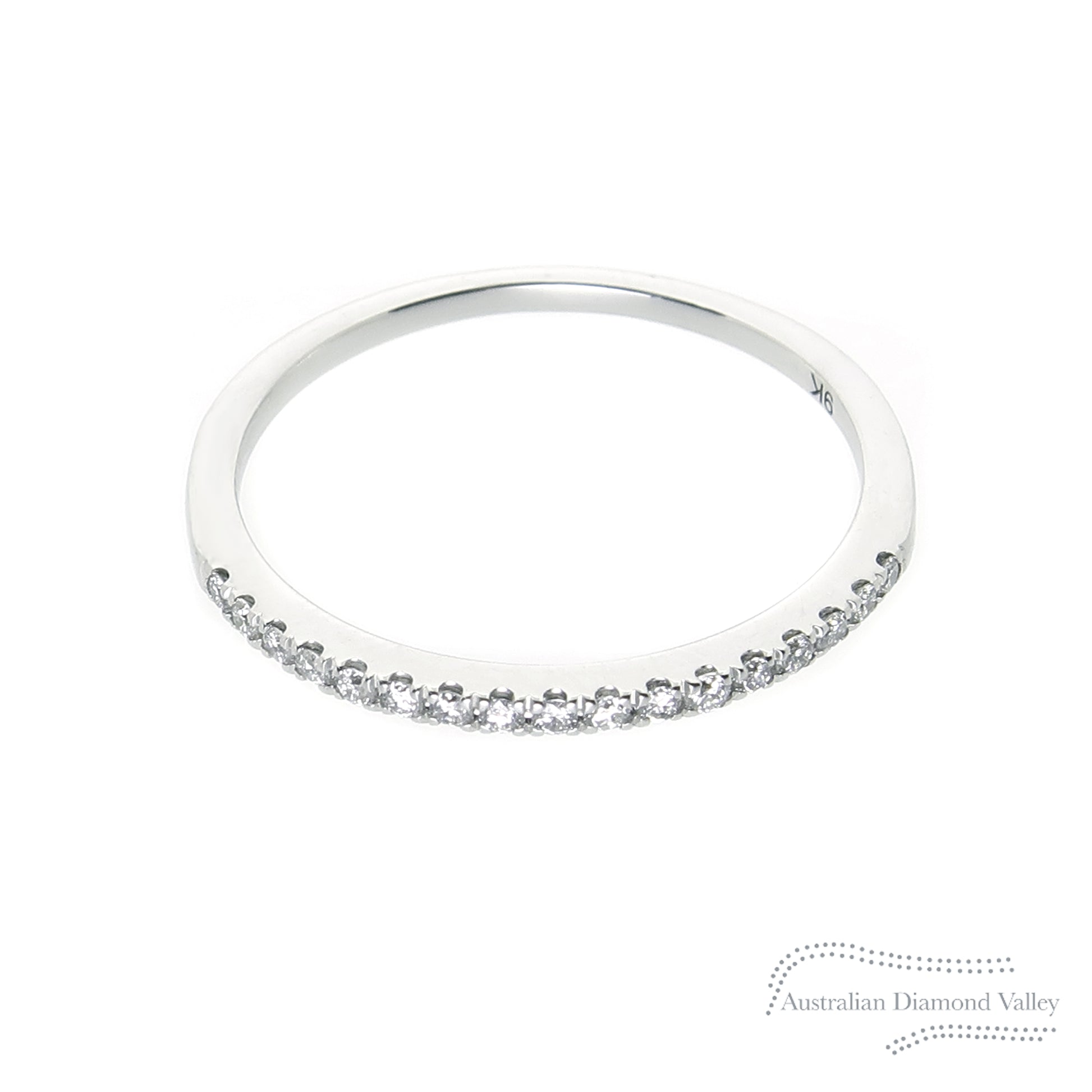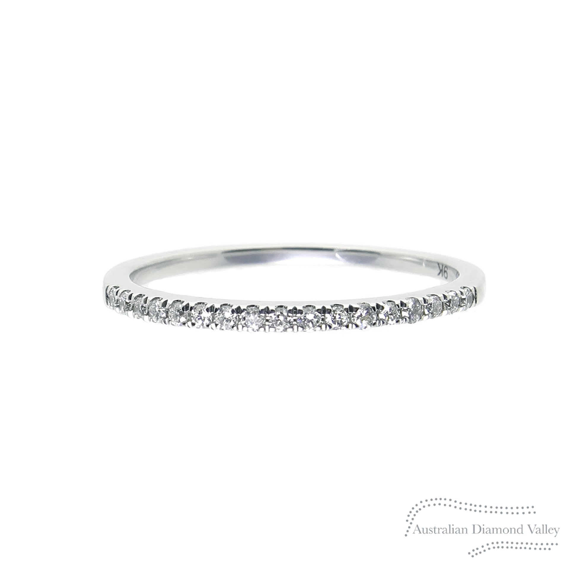 Our beautifully fine 9kt white gold Sunrise diamond ring band features 17 perfectly set round brilliant cut Argyle Australian diamonds, a total of 0.12 carats.
