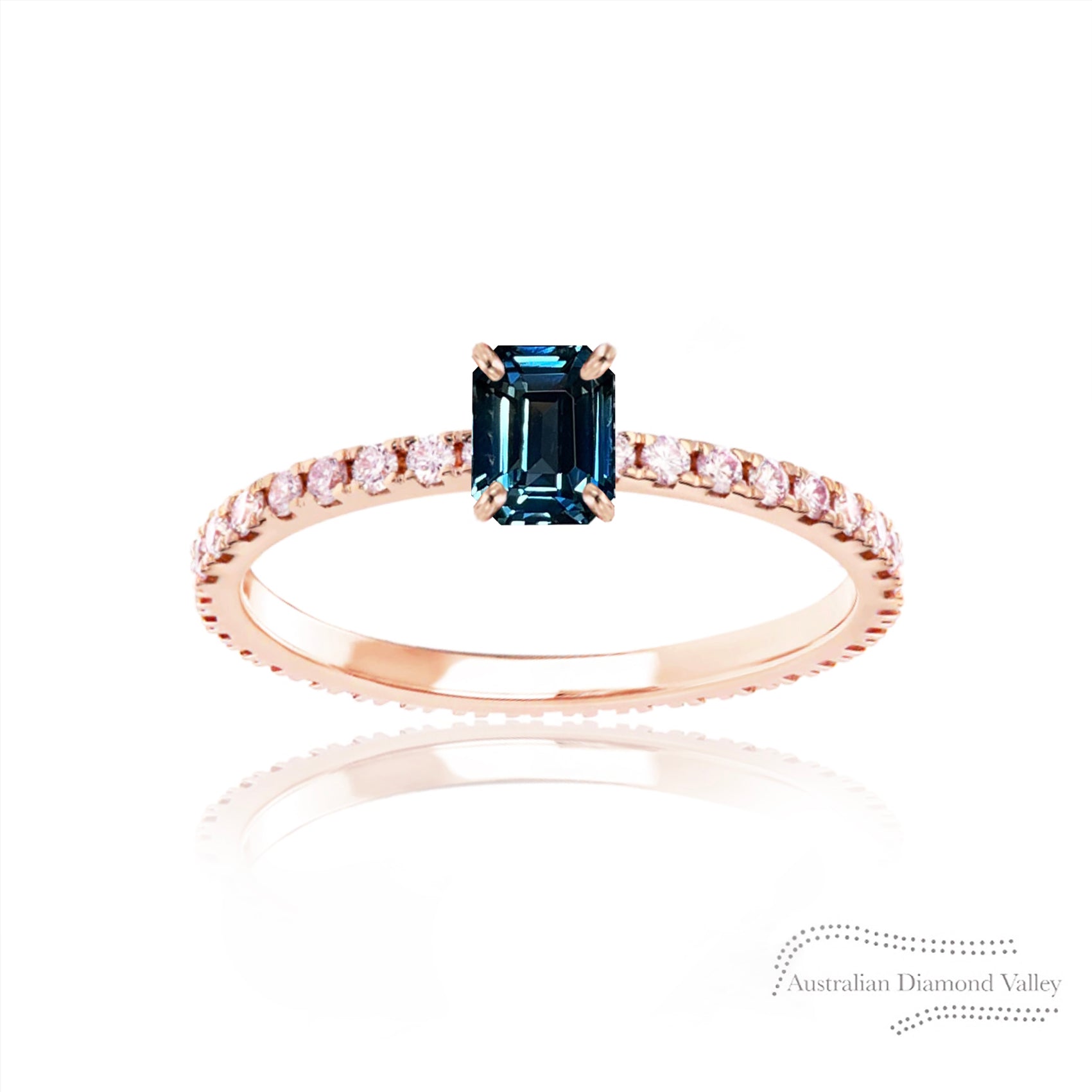Select a petite Australian sapphire and have it set on a band of pink Argyle origin diamonds. Crafted in 18kt rose gold. A beautifully designed ring with claw setting details.